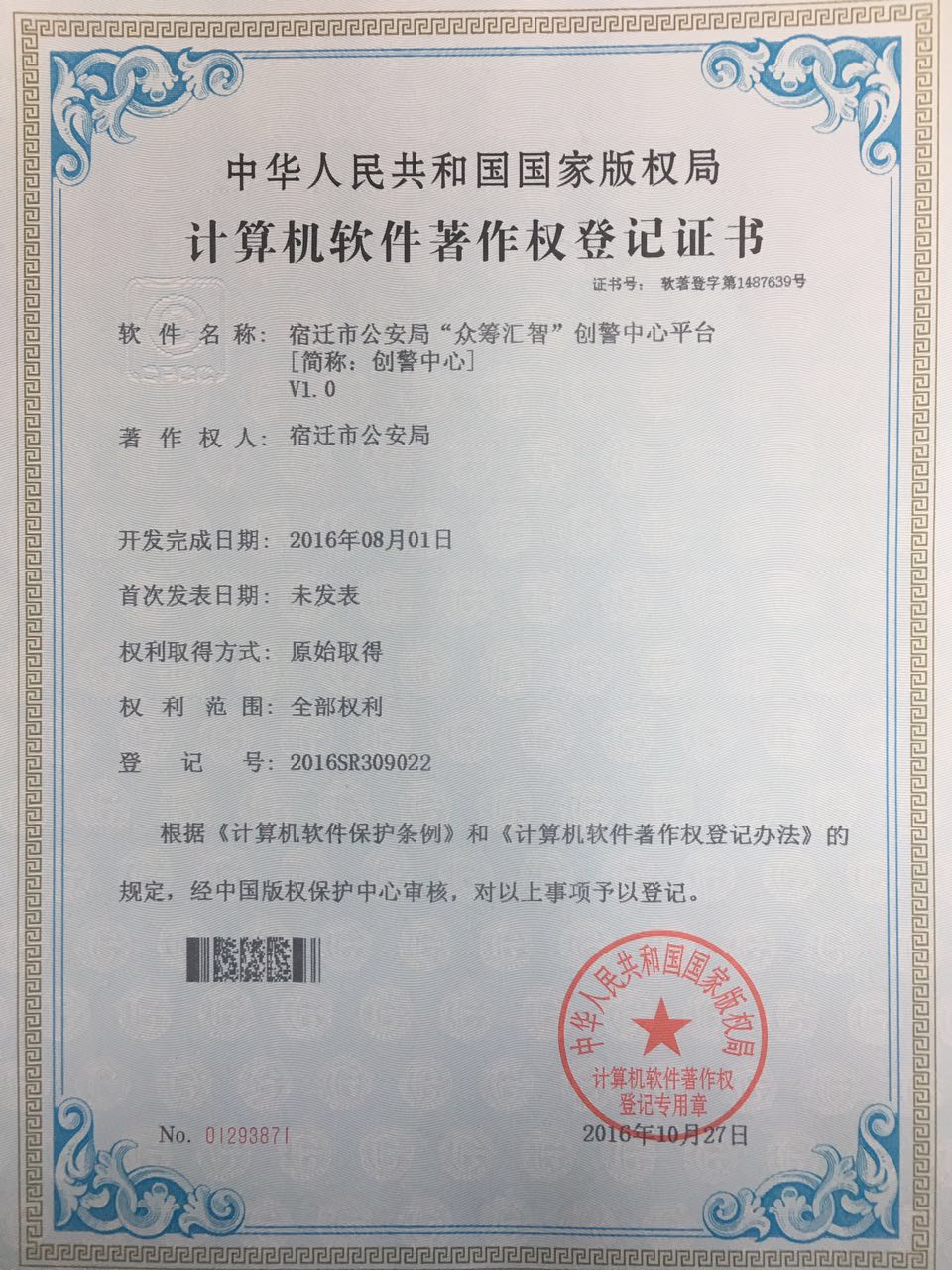 近日,由我司同宿遷市公安局自主研發(fā)的宿遷市公安局“眾籌匯智”創(chuàng)警中心平臺成功獲得軟件著作權(quán)登記證書。 市局研發(fā)的創(chuàng)警中心平臺為國內(nèi)首次發(fā)布,系市局首個自主開發(fā)、擁有自主版權(quán)的計算機軟件。此次軟件著作權(quán)的取得,對外展示了我...